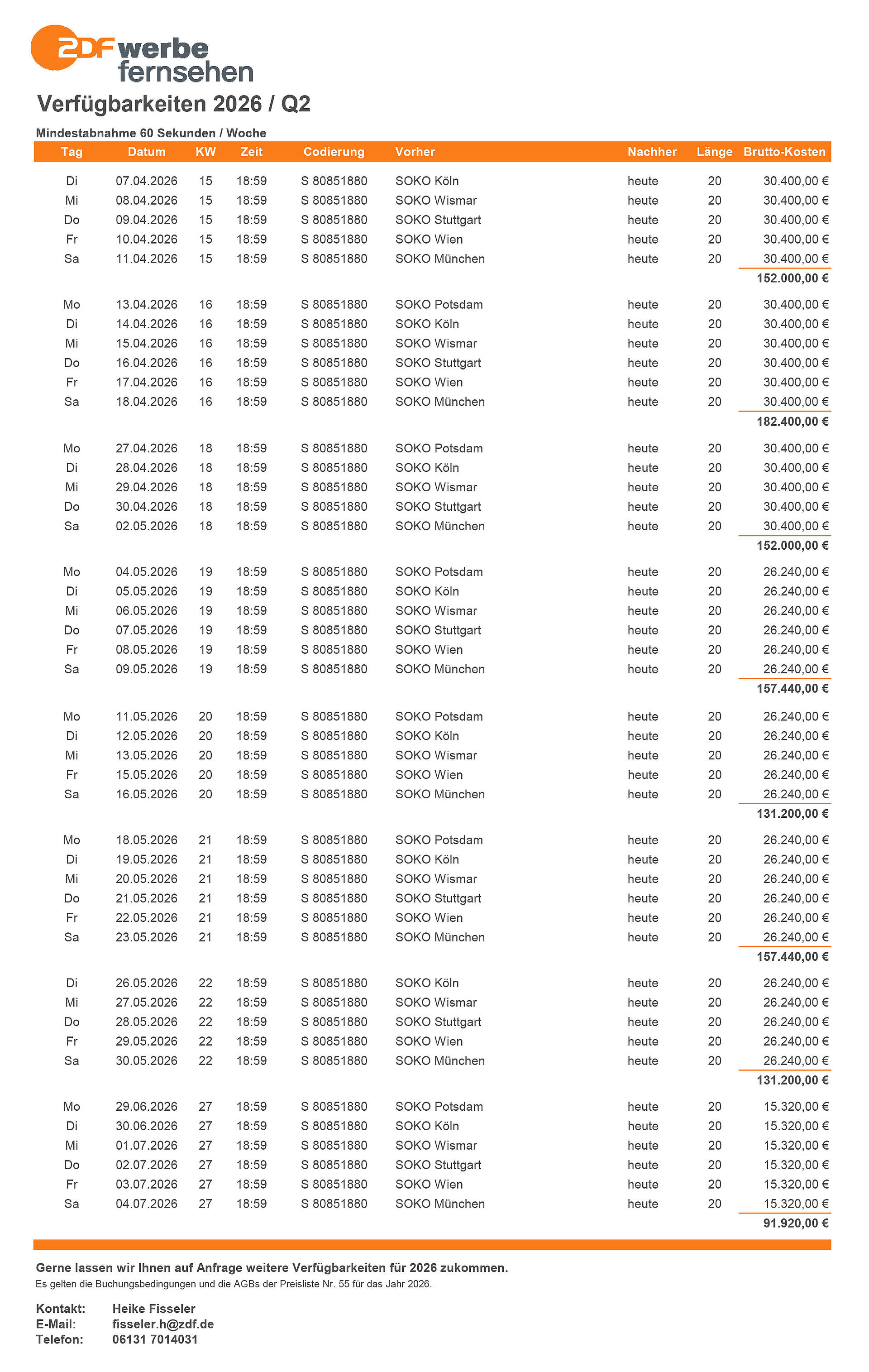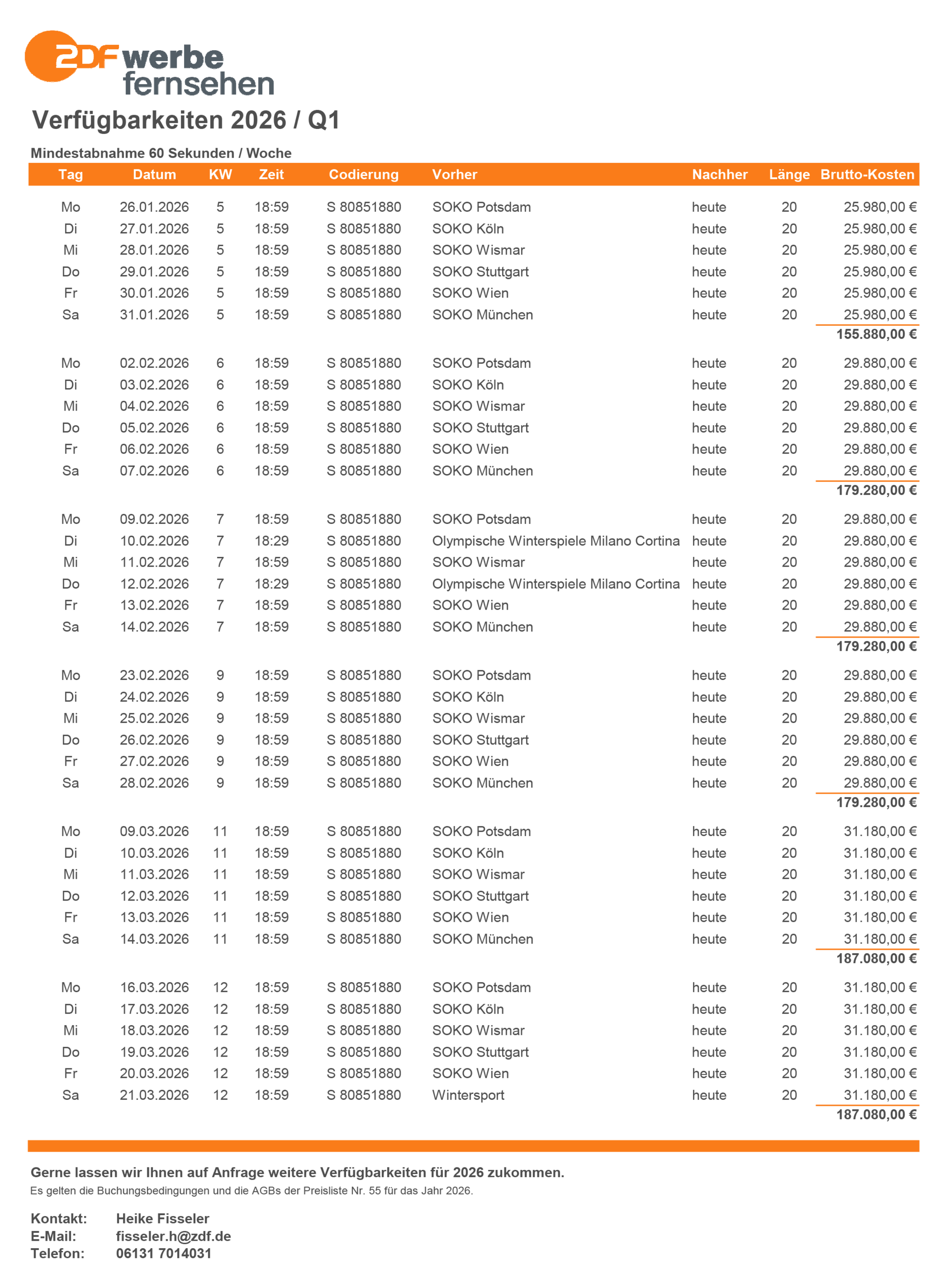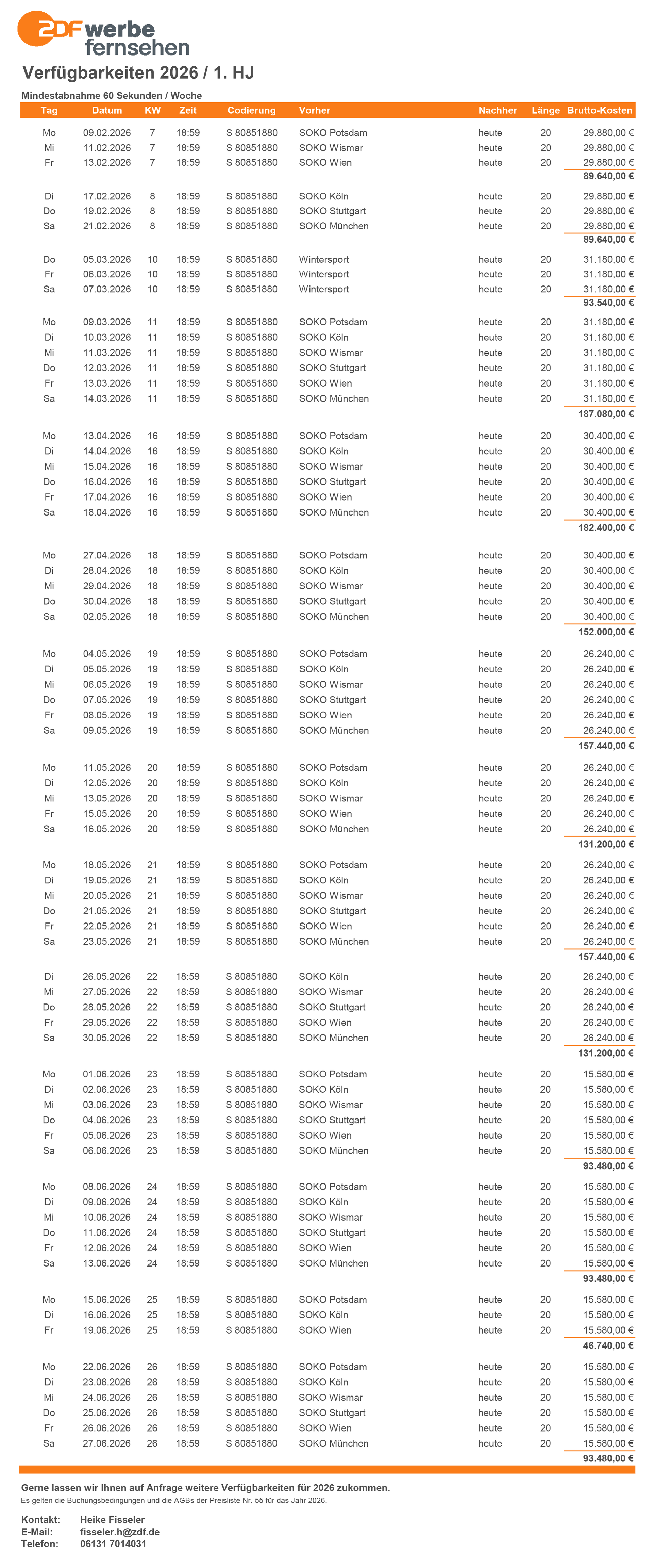 Sichern Sie sich Ihren einzigartigen Werbeplatz für die kommenden Monate. Die Einschaltpreise für die einzelnen Kalenderwochen finden Sie in der Servicebox „Downloads“. Gerne lassen wir Ihnen auf Anfrage Verfügbarkeiten zukommen.